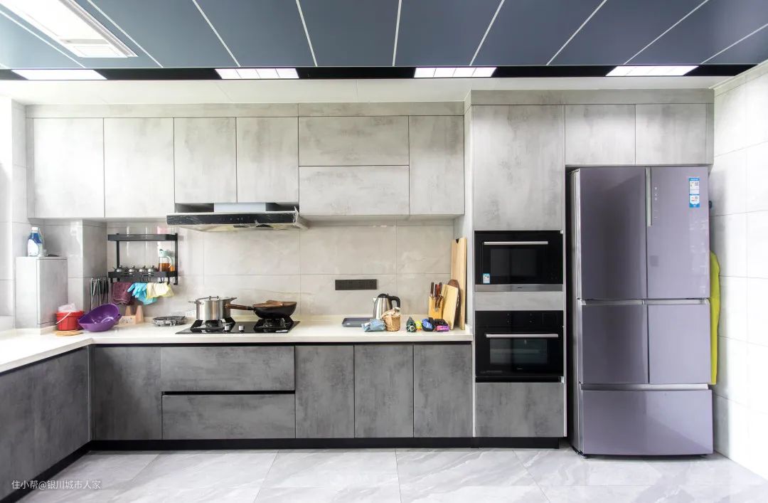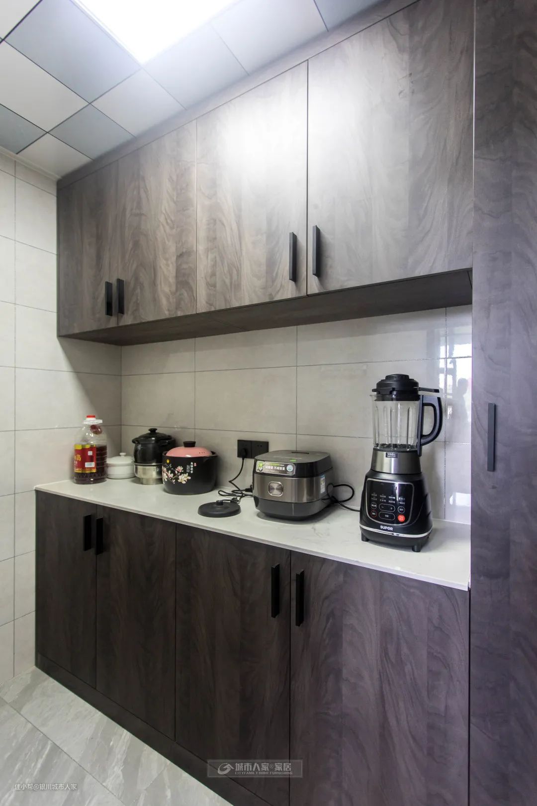 宽敞的厨房用纯粹的黑白灰简约风格粉饰,实用不做作,而L型的设计更是将空间利用最大化,充分利用每一个角落,不浪费一分一毫。一旁的储物间设计成厨房的补充区域,煮饭、烧水等都可以在这里进行。