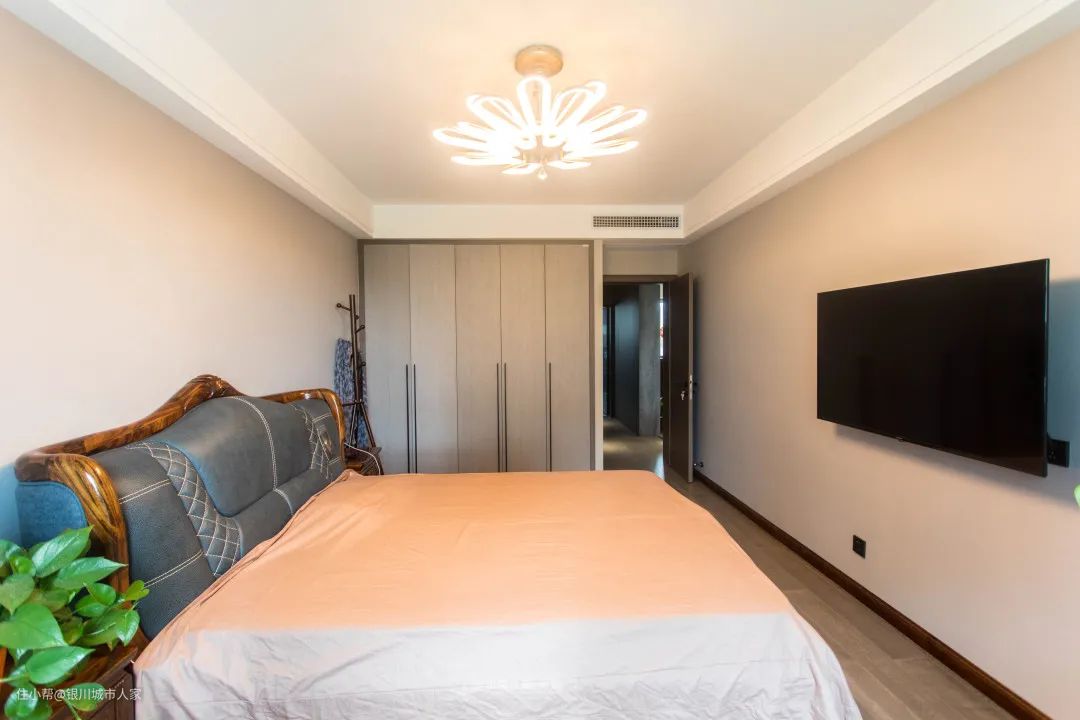 次卧床头背景墙设计成简约大气的灰色,让卧室变得格外雅致。华丽的吊灯,散发着柔和温馨的光线,整个室内光线明亮而柔和。床头柜上摆放的台灯和清新的绿植,荧荧宫灯,灼灼流光,使人沉醉其中。