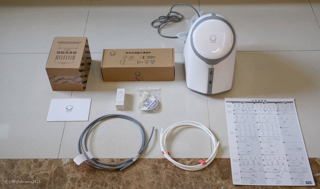 ▲觉飞心愿内衣裤洗衣机共两个版本,分别是标准版和家庭版。我选购的是家庭版,包装内置有主机*1、洗涤硅胶袋*2、50ML专用洗液*1、软水过滤器三通组件盒*1、白色进水&灰色出水管*1、以及使用和安装说明书。
