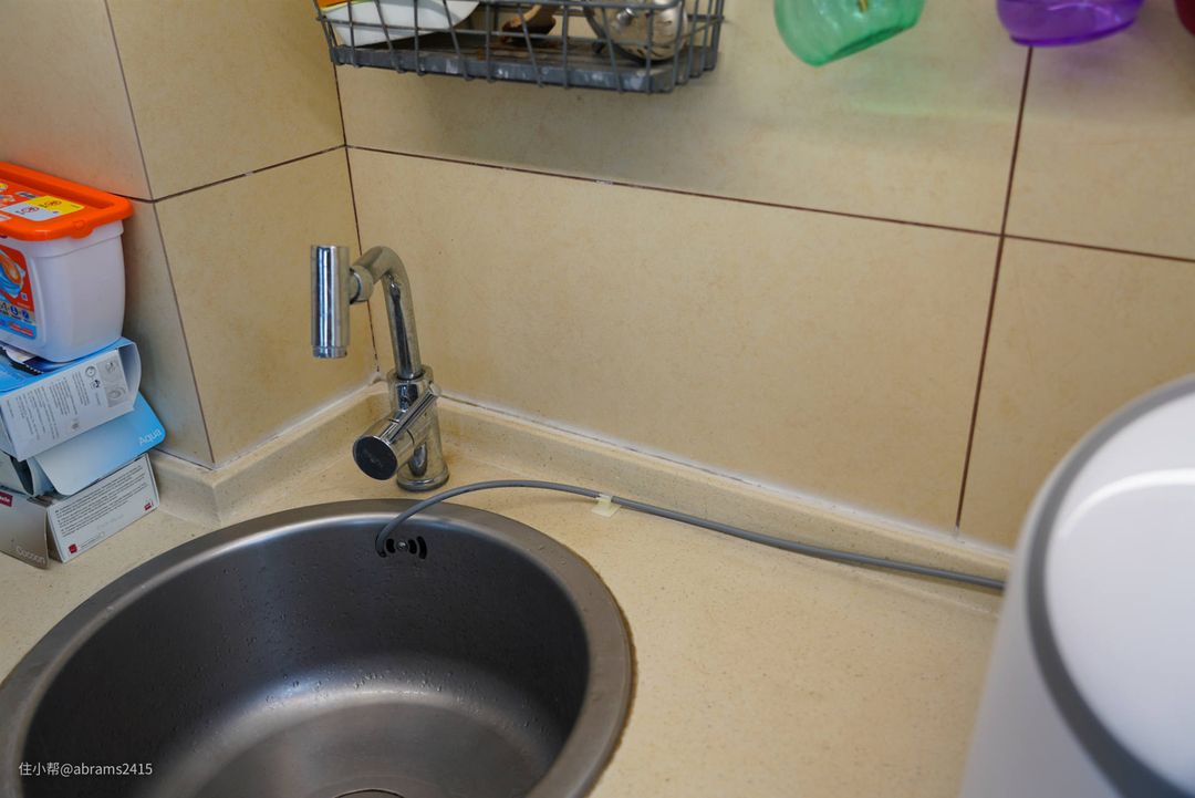 ▲配件包里有管夹贴,我把出水管接到了台盆溢水口,从那边进行排水。