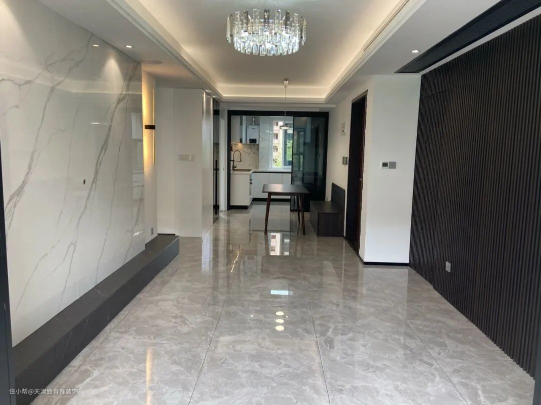 客厅做了岩板的电视背景墙。虽然不是大理石做的,但是也很有质感。很不错,特别时尚,更符合现代简约风格的特点。同时我做了一个隐形的沙发背景墙,也就是有一个房间的门,打开才知道,但仔细看的时候是隐藏的。格栅的设计让人羡慕。天花板安装在整个屋顶上,很有空间感,尤其是开启灯带的效果。它太温暖舒适了,而且非常漂亮。家具进场后,效果会更加完美。