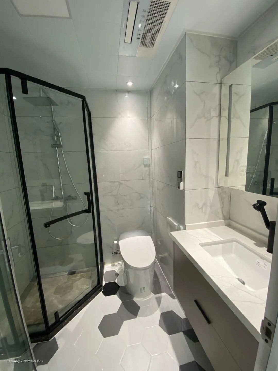 卫生间空间合适,干湿分离相对标准,洗澡时整个区域都不会被淋湿,清洗时也会方便很多。布局合理,安装了柜镜,可以适当增加一些收纳空间。真的很好。