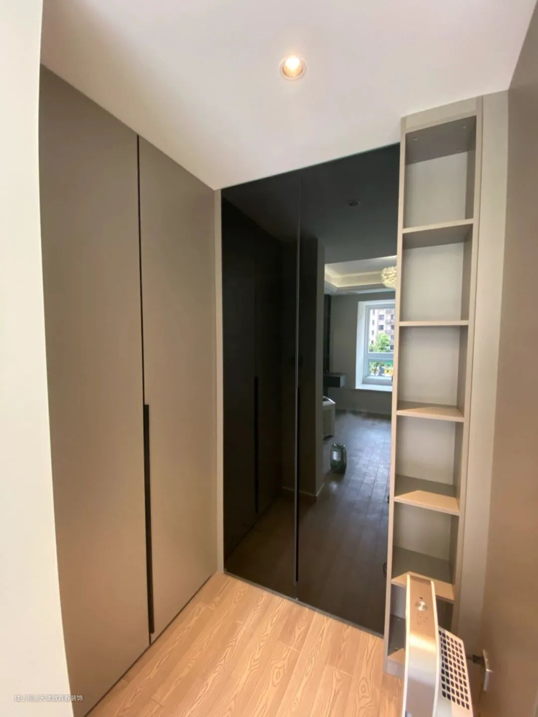 拥有一个小衣帽间可以提供充足的储物空间,方便存放更多的衣物。定制的柜子做工和质量都不错,细节处理的也不错,所以都很喜欢。虽然没有选择白色,但颜色相对耐脏。