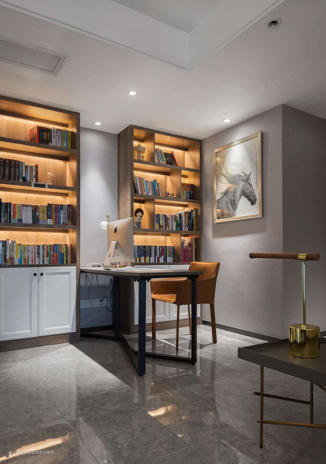 阅读区采用木质材料安装两面书柜,下方设置柜门,不仅可放置大量书籍,还起到了空间收纳的作用。在书柜的每一层安装镁光灯带,照亮阅读区域提升了实用性,而且美观惬意。