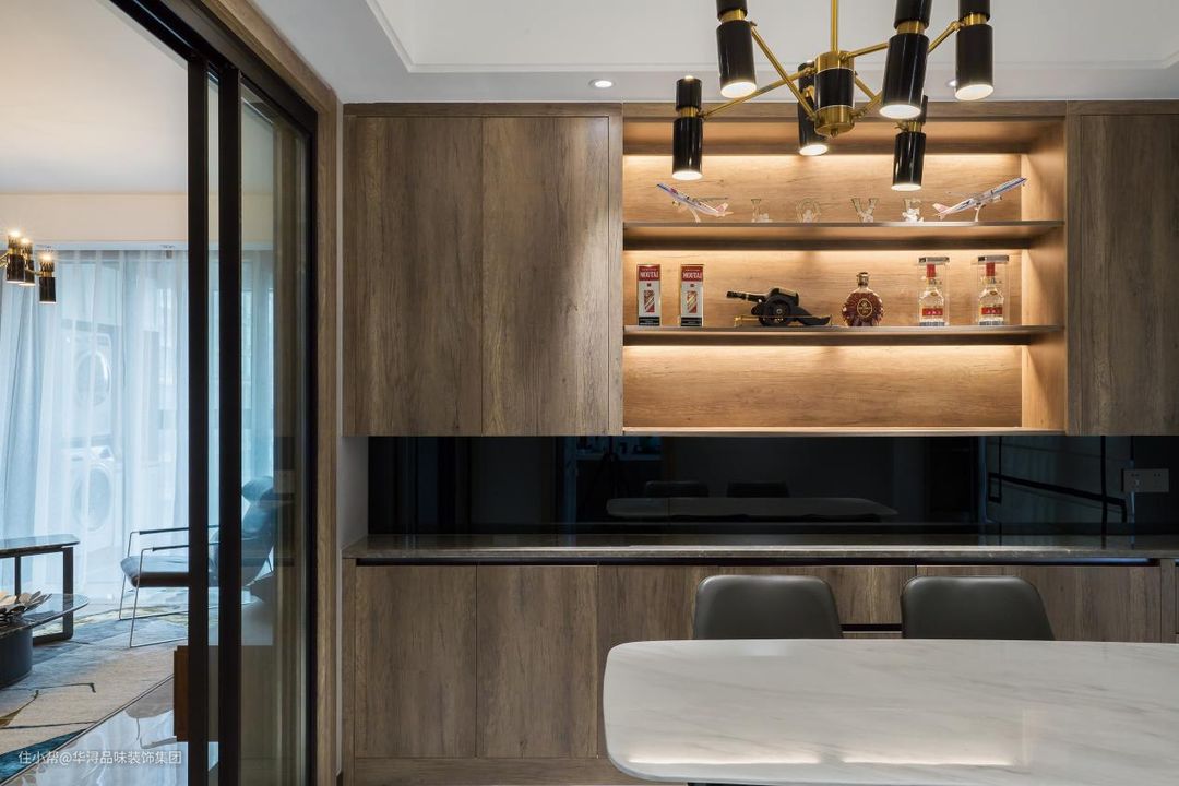 厨房窗户豁达,采光性强,白色操作台面使空间干净透亮,深色木质橱柜气质沉稳但不笨重,完美的体现了现代轻奢的设计要求且节省空间,使厨房空间明亮、平静。