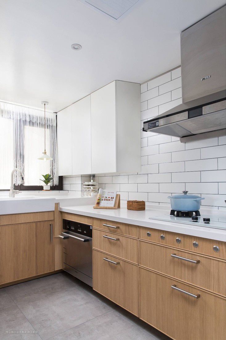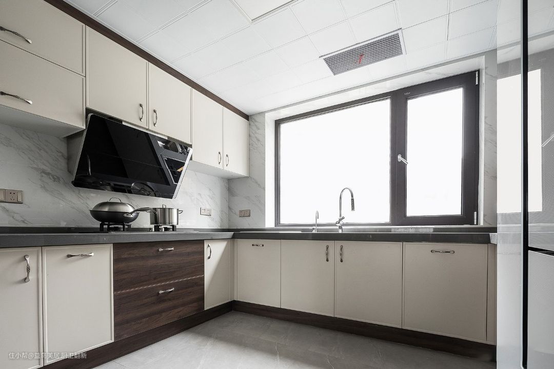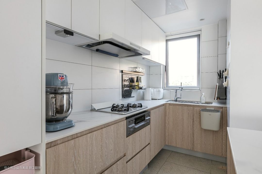 (2)柜门不要选择太过复杂的造型,越简单越好,厨房是油烟重地,简单的橱柜方便我们后期打理,可选用上浅下深的配色,更有立体感,还显得厨房空间能大一些。