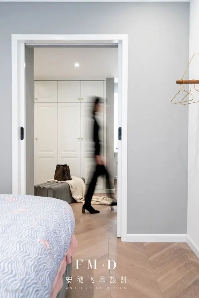 其实,落地的衣帽架不仅玄关常用,卧室也很常见。所以,在卧室,也可以利用挂钩、墙面衣架等方式取代: