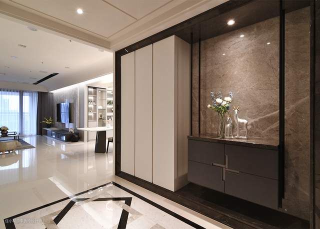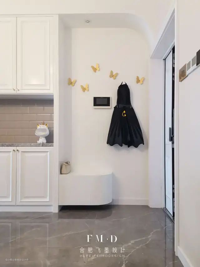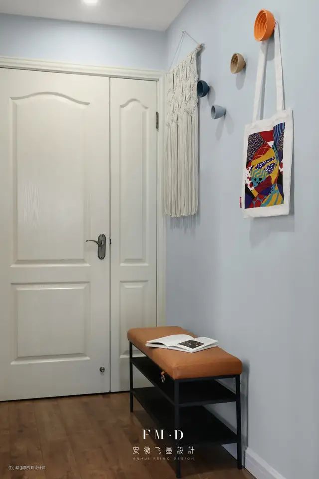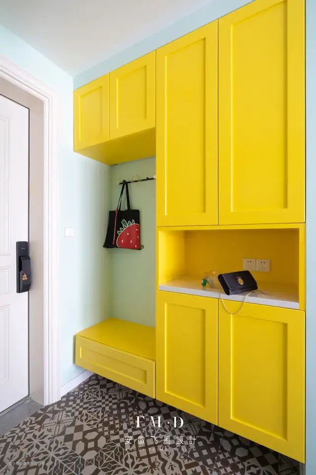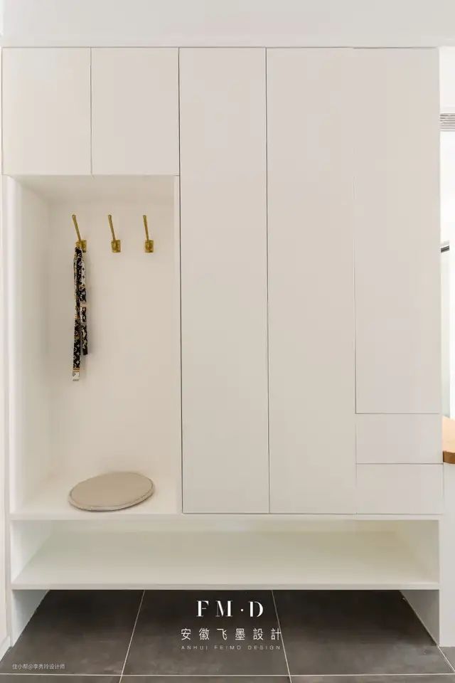 若玄关有顶天立地的玄关柜,可以利用柜体空间在适当位置留空做成开放式,可挂东西,也可作为换鞋区就坐: