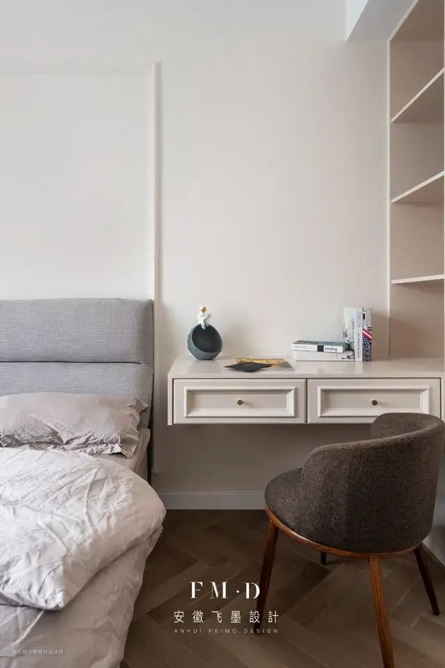 与壁挂抽屉的原理相似,壁挂式的书桌或梳妆台避免了卫生死角,营造更高级的视觉效果: