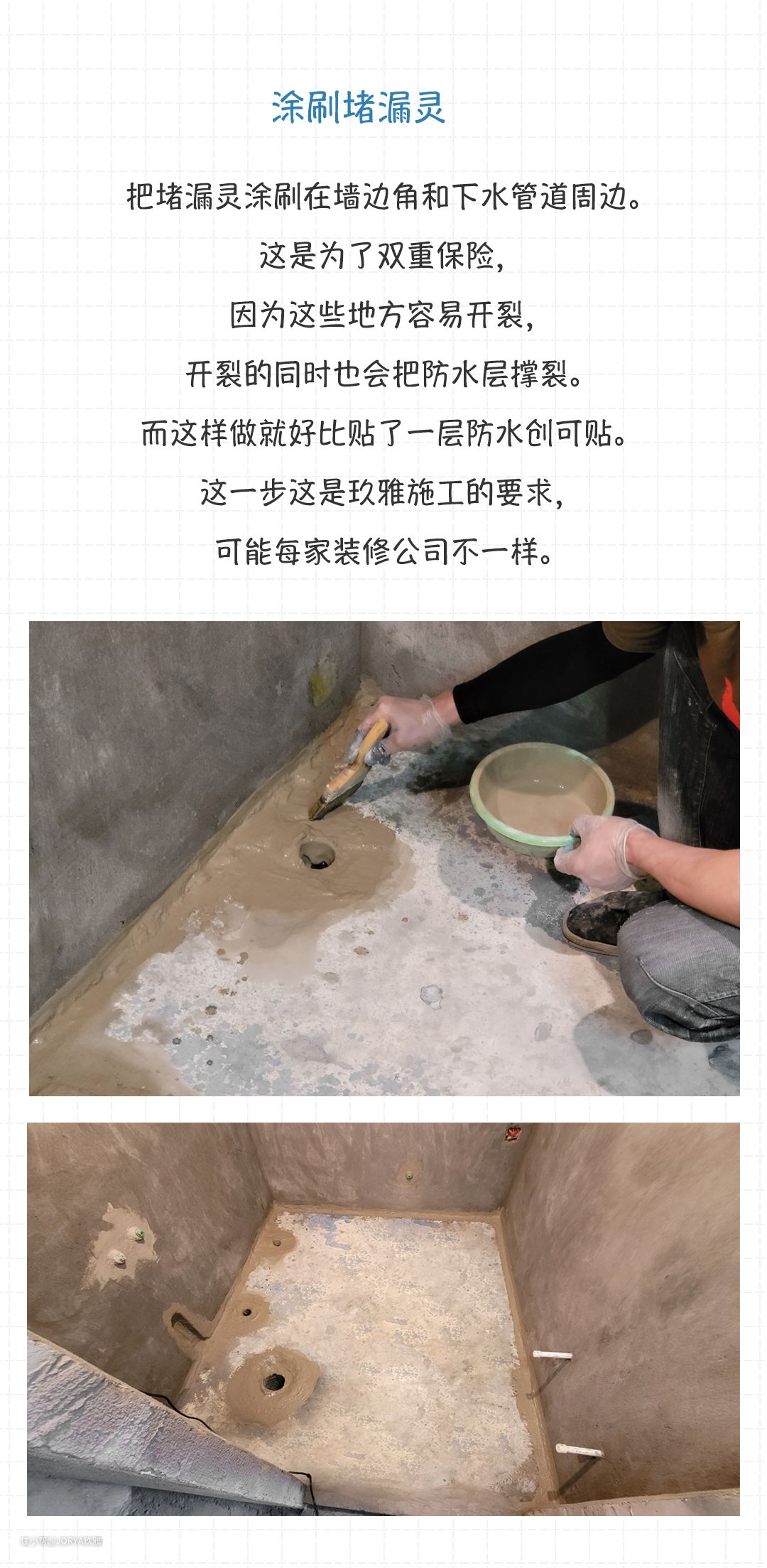 把堵漏灵涂刷在墙边角和下水管道周边。这是为了双重保险,因为这些地方容易开裂,开裂的同时也会把防水层撑裂。而这样做就好比贴了一层防水创可贴。这一步这是玖雅施工的要求,可能每家装修公司不一样。