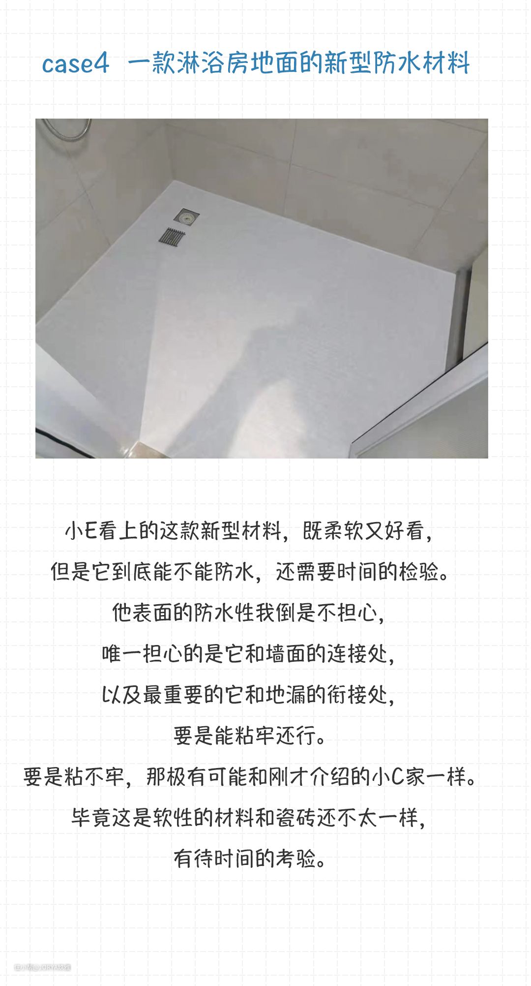 这个脚感好、柔软也好看,但是它到底能不能防水,还需要时间的检验。他的表面的防水性我们不必担心,唯一担心的是它和墙面的以及最重要的和地漏的衔接处,要是能粘牢还行。要是粘不牢,那极有可能漏水。毕竟这是软性材料和瓷砖还不太一样,有待时间的考验。
