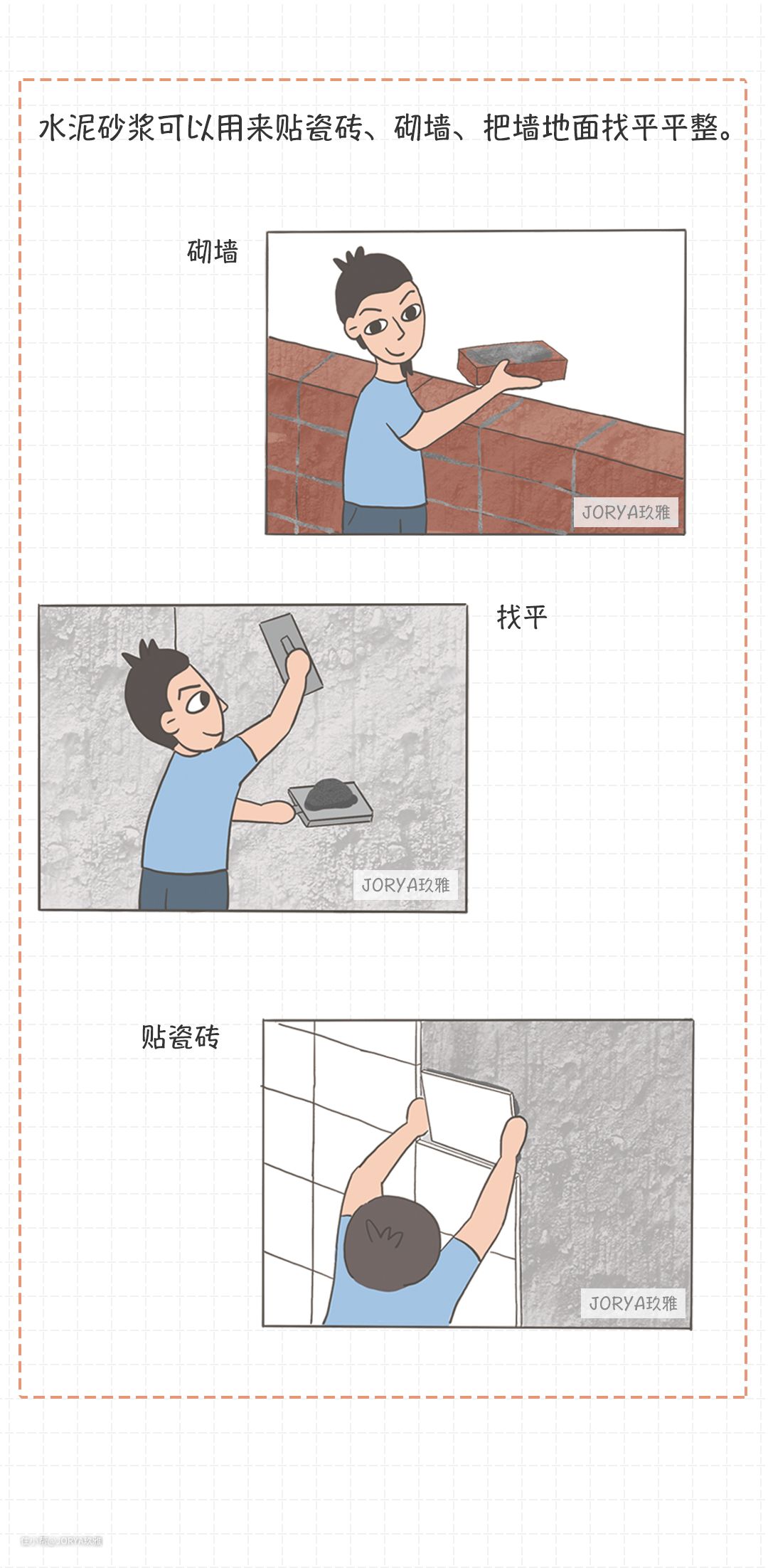 水泥、沙子、水三种材料混合在一起,搅拌成橡皮泥一样可以粘贴的材料。