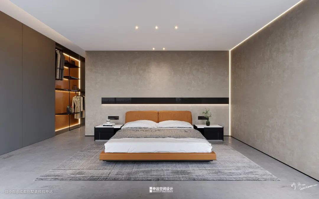 在卧室方面,卧室简洁明了,素雅的格调。在材质选择上设计师坚持简约质朴,没有多余的修饰,没有过于奢侈的点缀,床屏隐藏柔和的灯光让人安静沉醉。