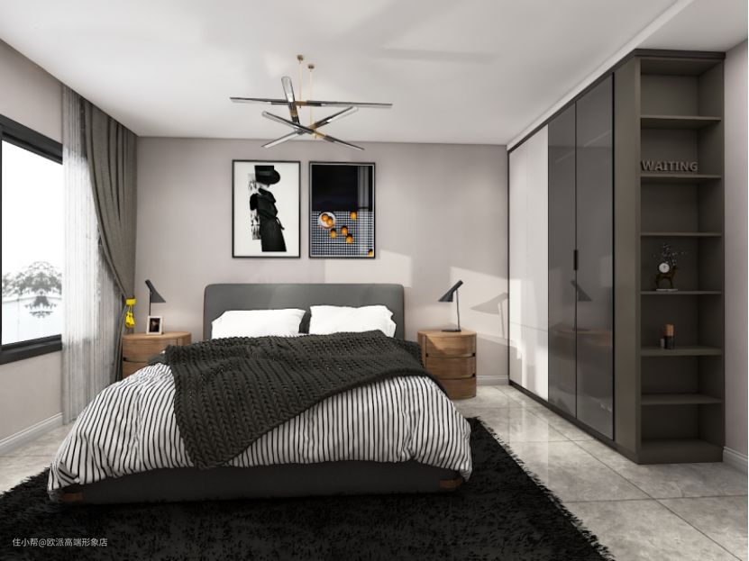 主卧运用黑白搭配的反差色,打造出自然舒适的时尚空间。极具设计感的灯饰,结合床头背景墙时尚挂画,再搭配具有装饰功能的实用性衣柜,带来更加舒适的视觉效果,营造出时尚现代的卧室空间。