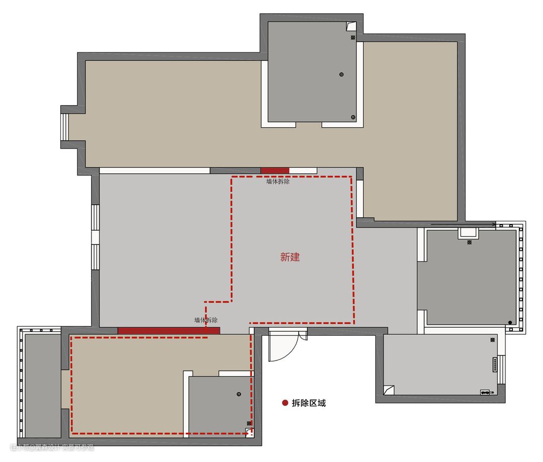 3、由于新建楼梯挡住次卧的门洞,拆除部分墙体做新门洞,选用谷仓门避免入户直对卧室门。