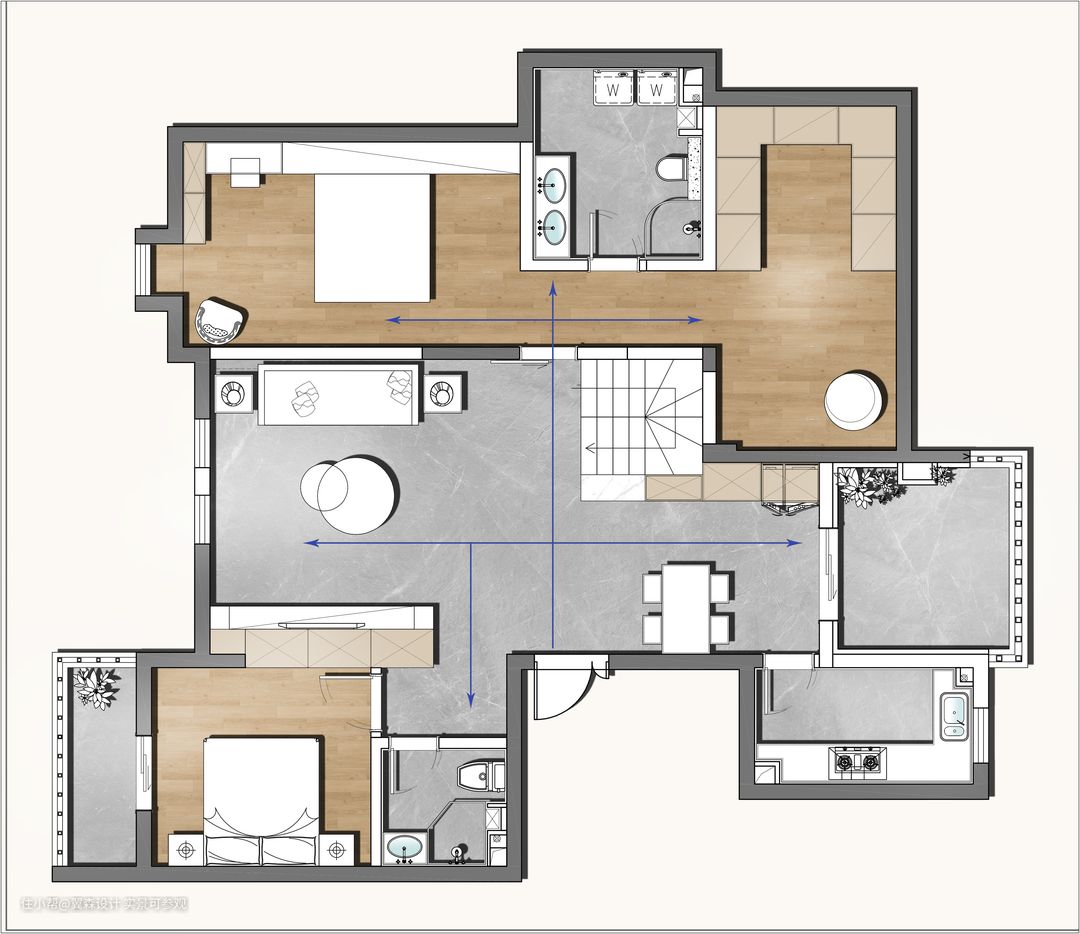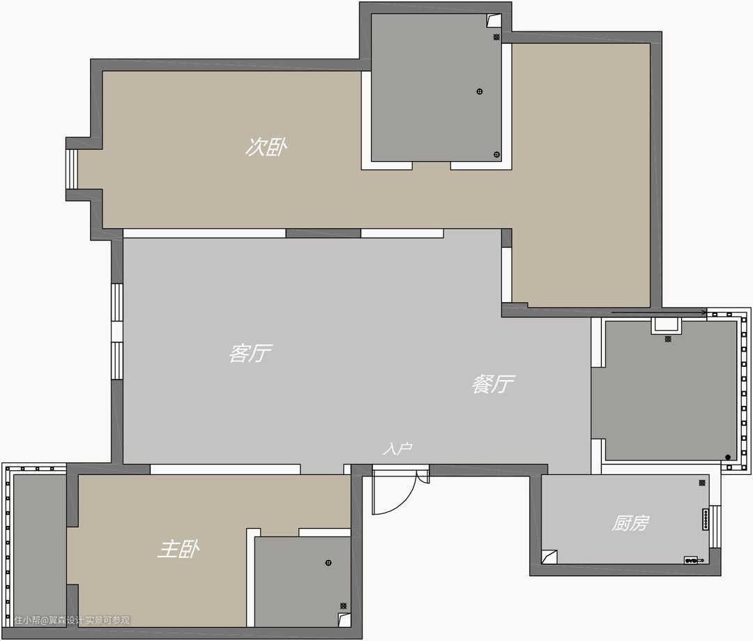 1、客厅窗户的下方有一个突出的大梁,为了看着美观,规划是对齐,所以拆除了客厅和原主卧相邻的大半部分墙体,客厅一侧新建墙体和大梁持平,房间一侧新建内嵌衣柜,和墙体持平,部分储物柜突出,挡住卫生间的门。
