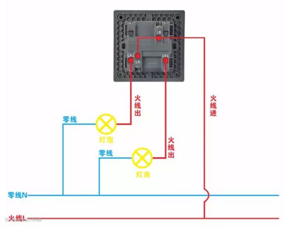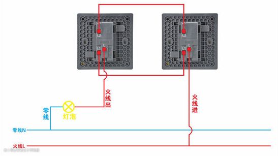 例如:入户过道筒灯控制,开门时开过道筒灯至客厅可以关闭过道筒灯,如果有两路可以采用双开双控;具体接线图如下