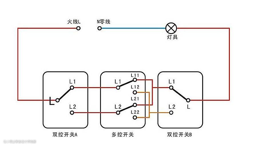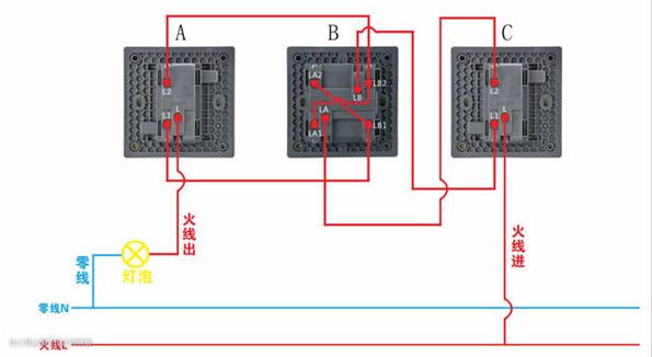 火线先进C开关的L极,从C开关的L1出线链接到B开关的LB极,C开关的L2出线链接到B开关的LA极。多控开关B的LA2与LB1串起来,LA1与LB2串起来。再从B开关的LB2出线到A开关的L2,从B开关的LB1出线到A开关的L1,双控开关A的L出线到灯泡,就完成了三个开关控制一盏灯。