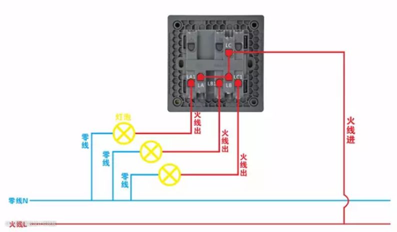 图“LA、LB、LC”接口为串联状态,只需一根火线或三根火线分别接入!