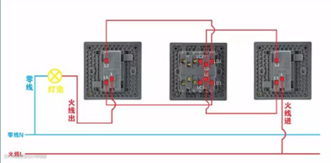 备注:三开双控用法跟单开双控接法一样;相当于三个单开双控接线柱多了;
