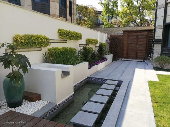 设计小庭院的时候,可以设置与整个庭院风格相搭配的水景。因为即使是最小的水景也能够起到扩大庭院视觉空间的效果,以简洁为主,选择睡莲、荷花等水生植物,但是不要让植物布满水面。
