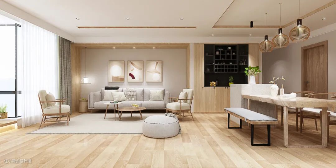 像白橡木、白蜡木之类比较浅色的木质感,在简约、北欧、日式风格中,这类浅木色的木质家具,就是非常合适的搭配选择了,适当加入布艺坐垫的设计,整个效果是自然温馨而舒适。