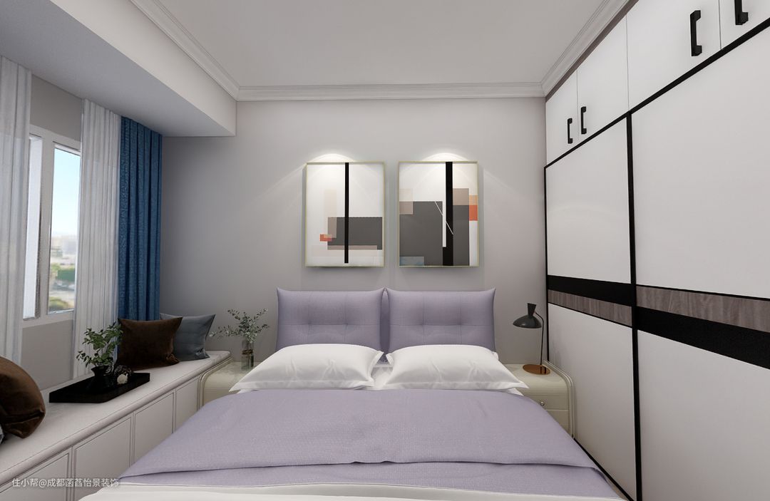 主卧以灰白色调为主,加入了香芋紫的床品搭配,温馨舒适的空间感瞬间UP.