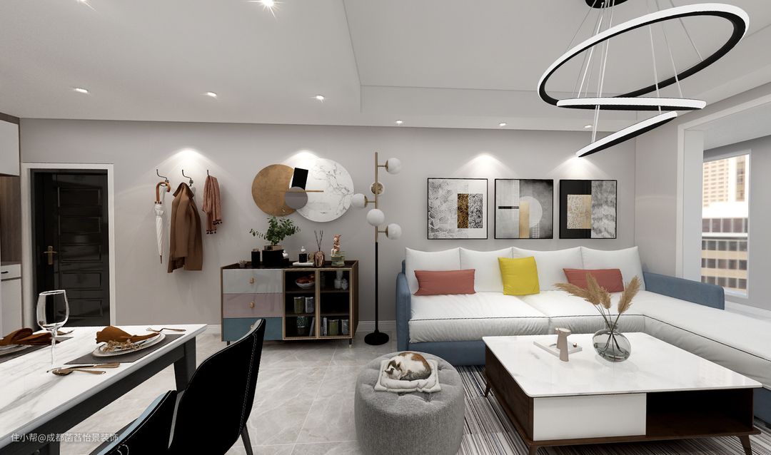 客厅区域地上地毯,布置布艺方凳、白色石材茶几,也让空间显得更加朴素优雅而现代精致。