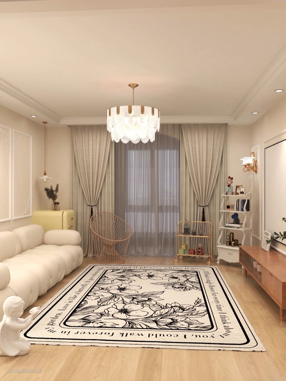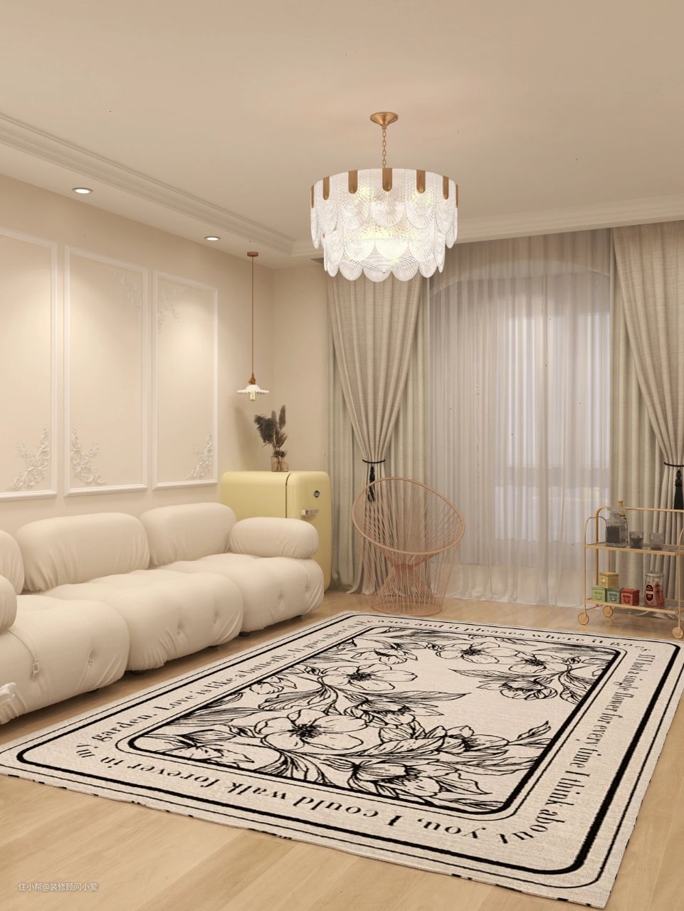 客厅中央的超大地垫,将新艺术时期自然植物的美尽数展现,不放茶几,空旷自然。落地窗旁有讲究线条感的推车置物架和座椅。