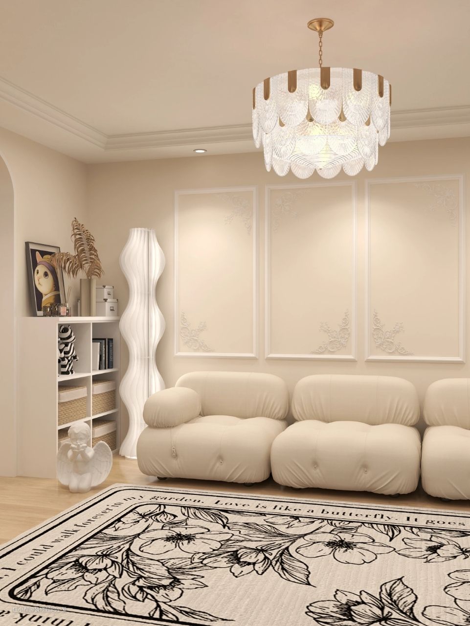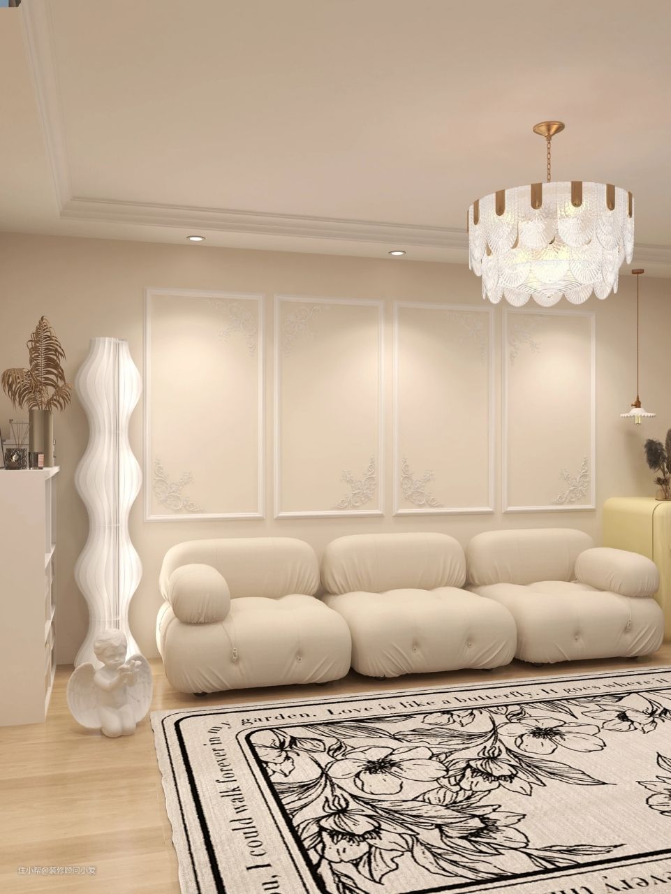 水晶吊灯和亚克力光影落地灯带来唯美浪漫的气息,丘比特石膏像,加上周围射灯的辅助,营造出雅致个性化的轻奢空间。