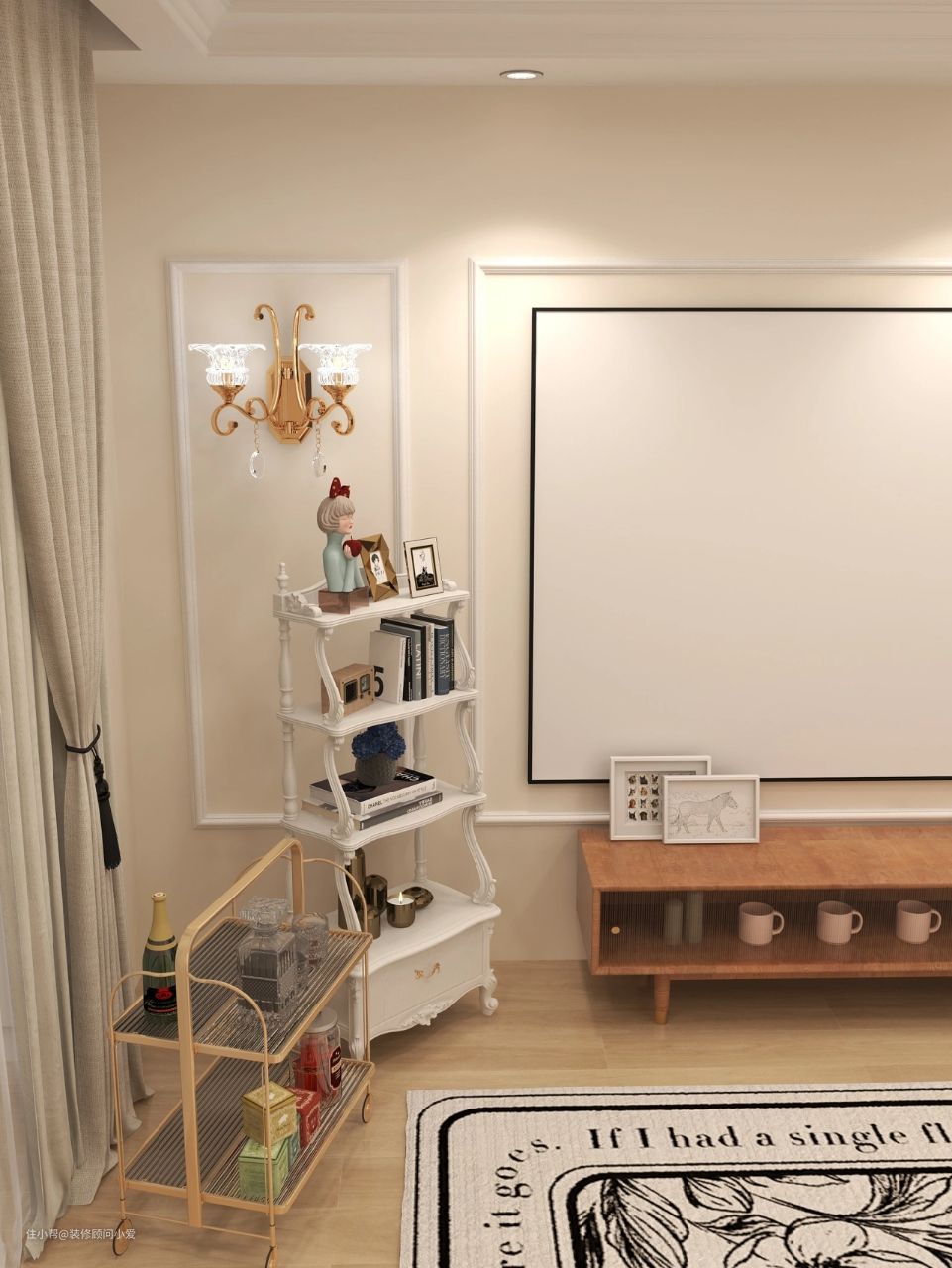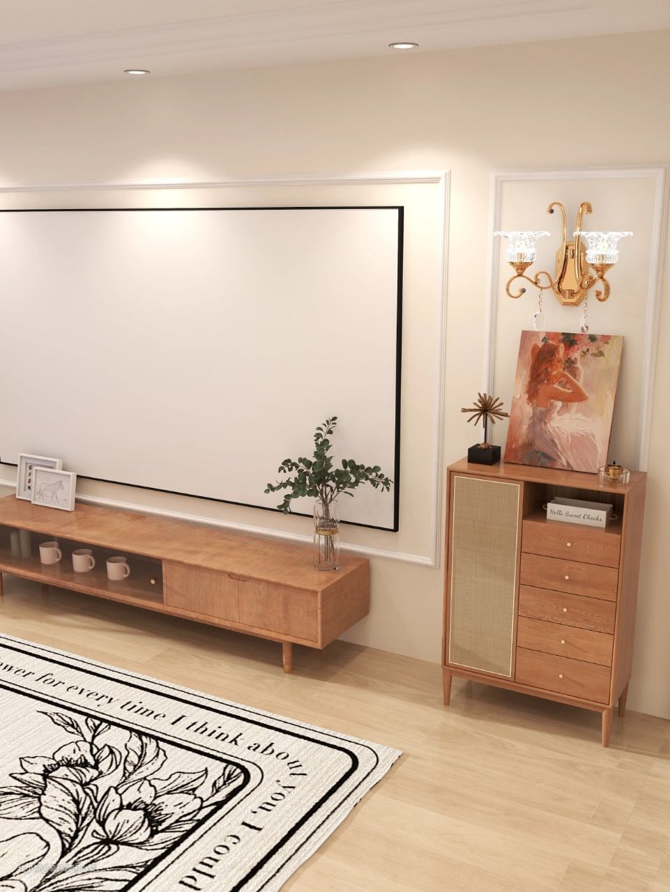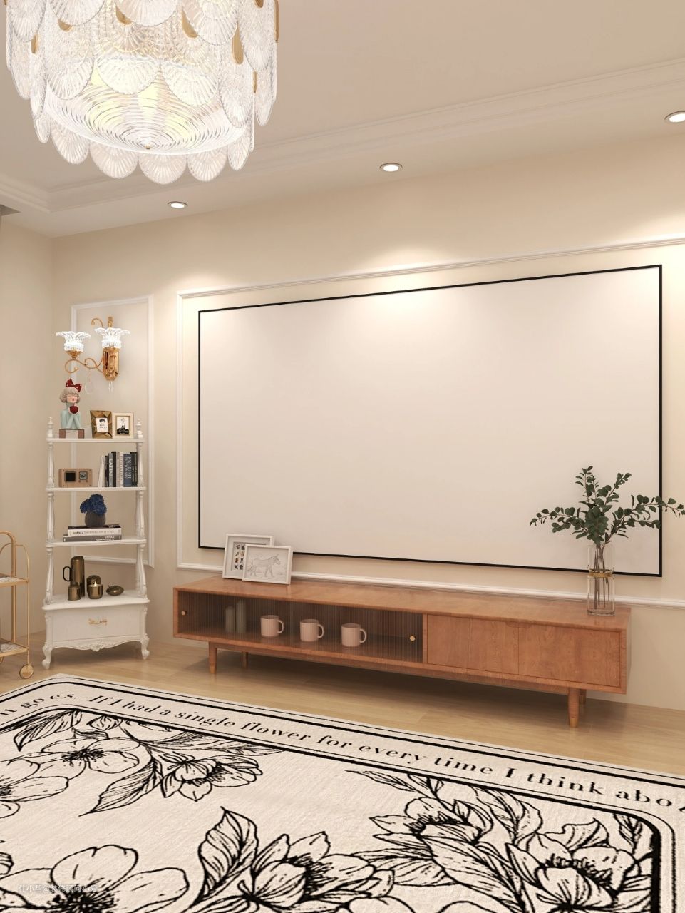 超大屏投影代替传统的电视机,下方安置简约的电视柜。