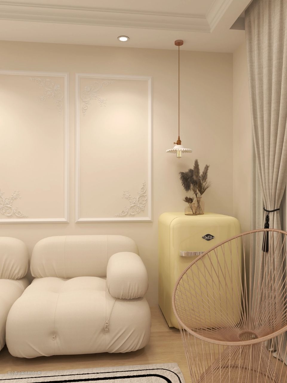 沙发墙用纯粹的框架线条装饰出美感,既简约,又有复古的韵味。迷你冰箱复刻经典,是颜值控、年轻人的首选小家电。