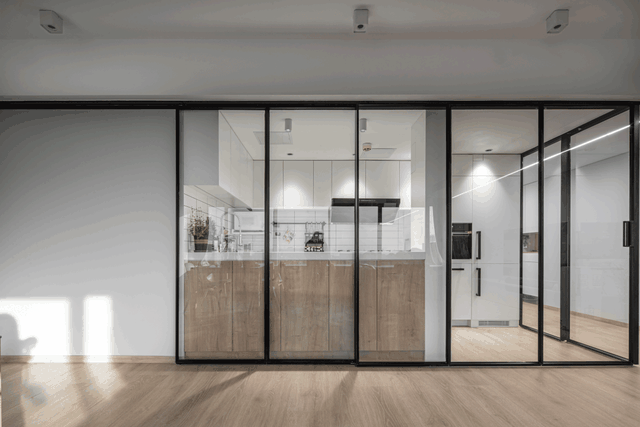 适合中式厨房的推拉门,大平层的墙面面积比较大,推拉门不占据面积空间也可以作为隔断空间,拉开就成为全开放式,小吧台区域可以作为西厨料理台,很方便和客厅空间的家人交流沟通。