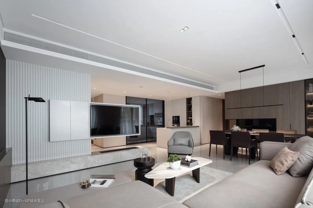 大平层的特点就是宽阔舒适,所以布局都会打破传统墙体隔断区域,客餐厨一体可以增进家庭氛围