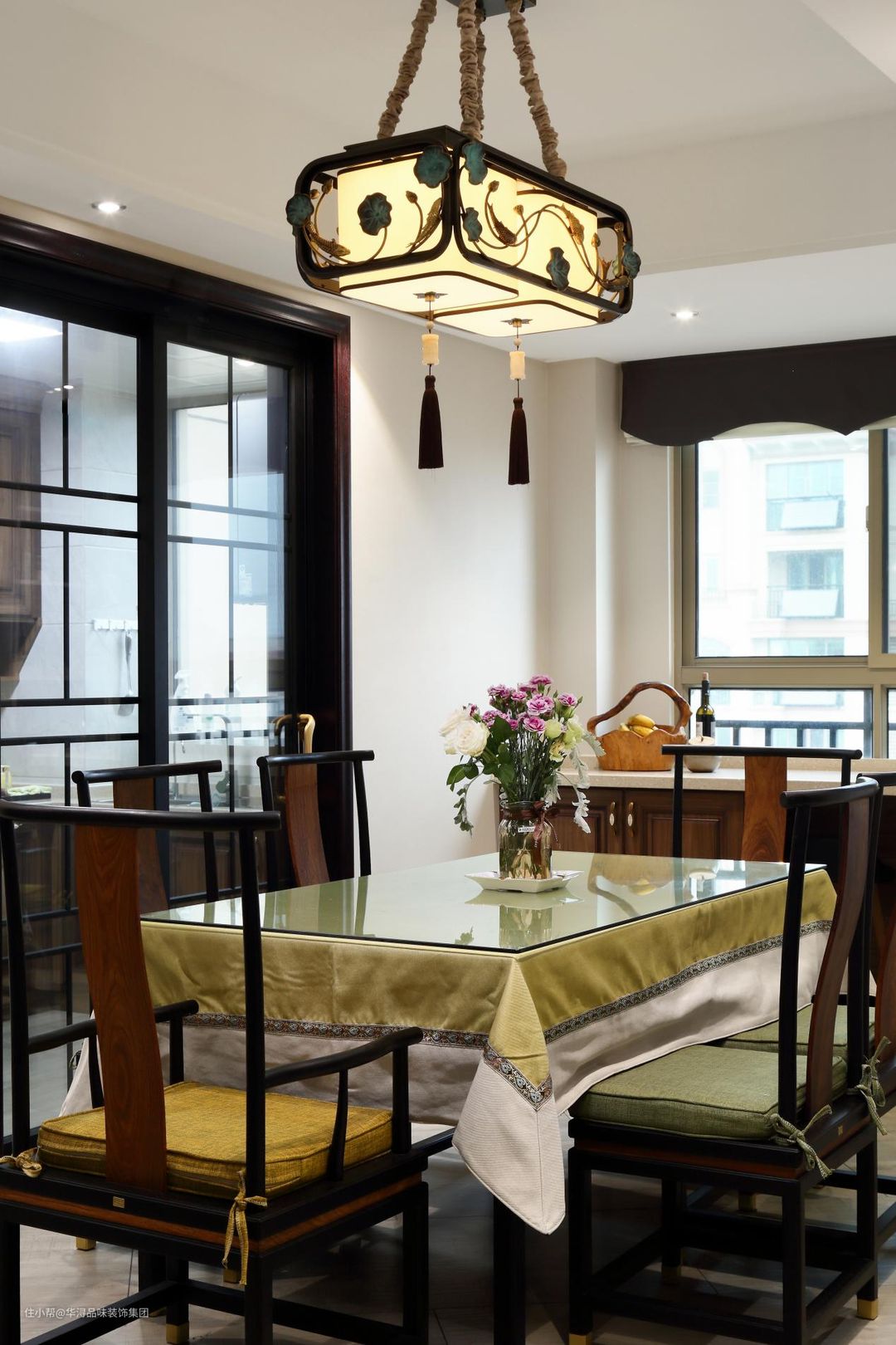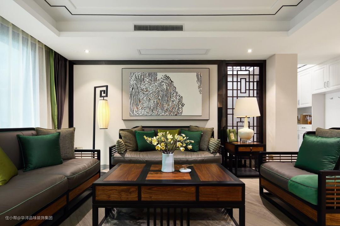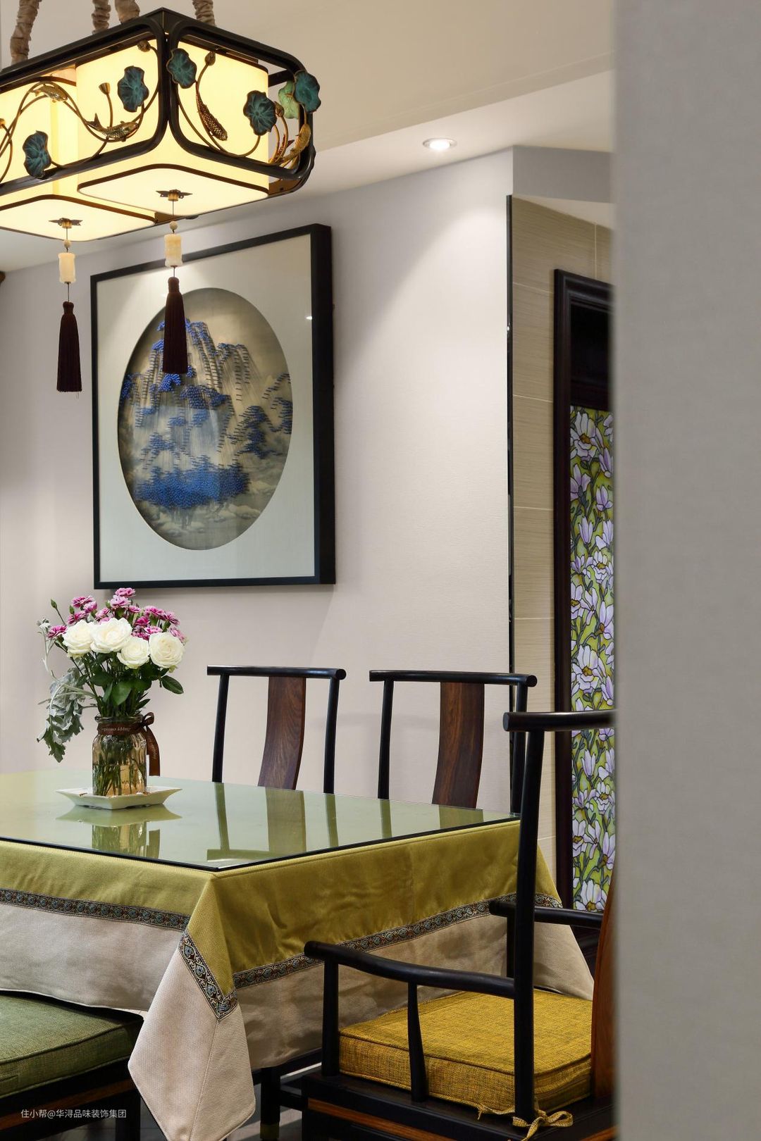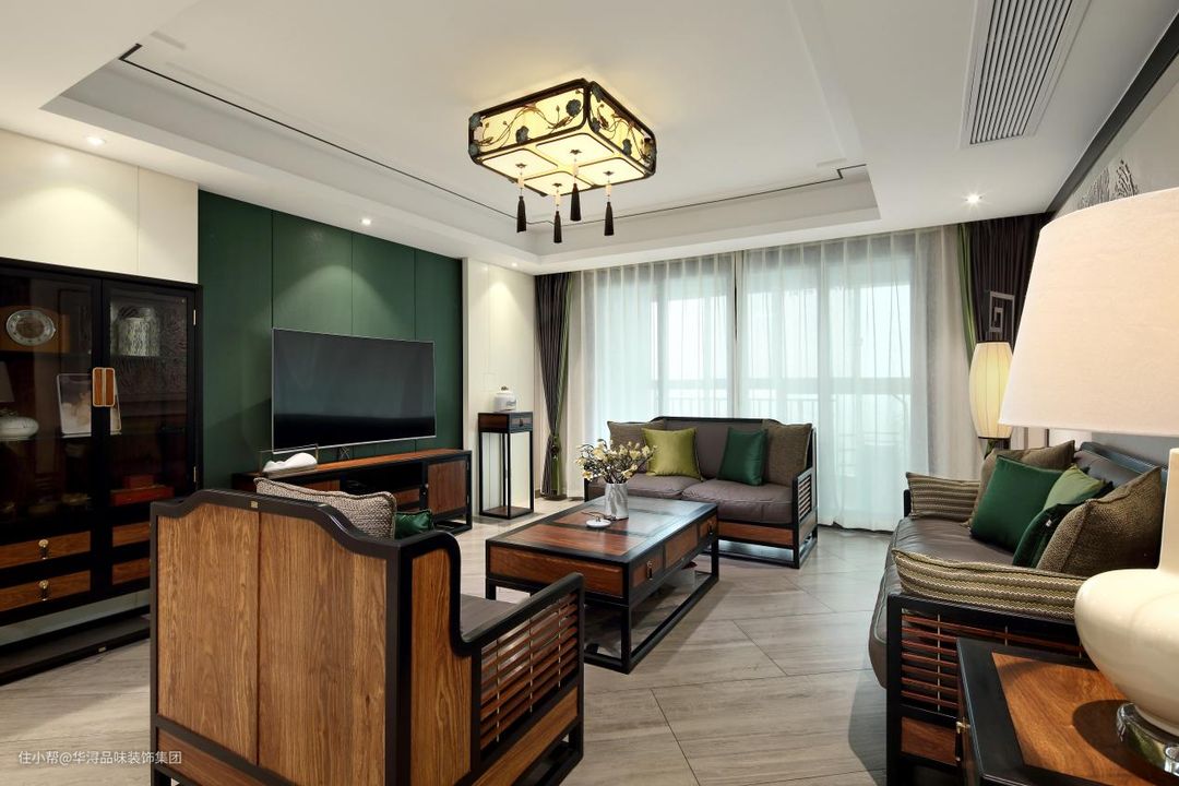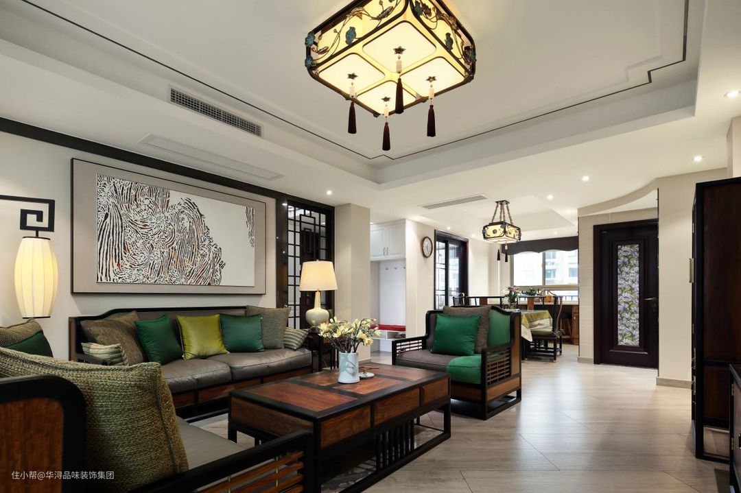 本案例是一款新中式装修的家装风格,中华传统原木色和现代时尚墨绿色的交织彰显着中式和现代感不同的美,中国风吊灯为客厅、餐厅增色不少,将空间点缀的端庄典雅。
