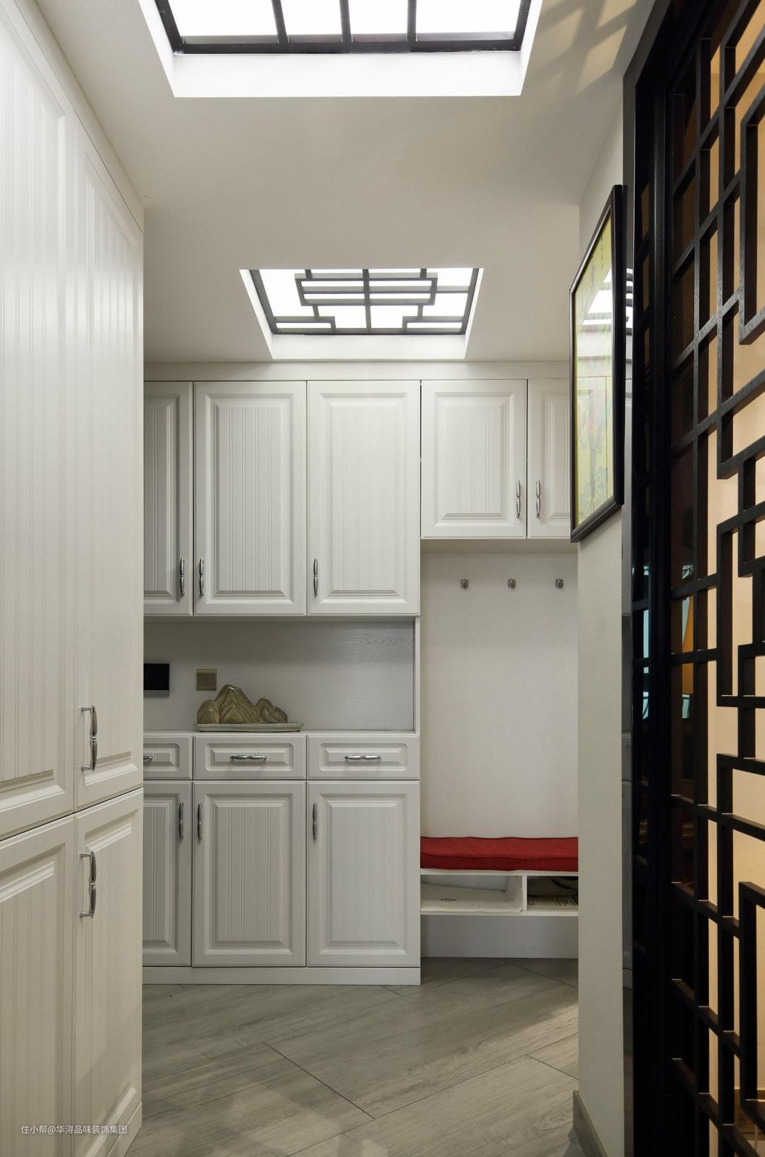 进门处的玄关做了一处转角设计,两侧各做了置顶的储物柜,上下没有留空隙,能够有效的防止藏灰。玄关处创新在天花板留有两处采光窗,这样的设计能够保证自然光的良好采集,视线不再昏暗。储物柜的柜门选择了白色,所以这片区域显得更加光亮。