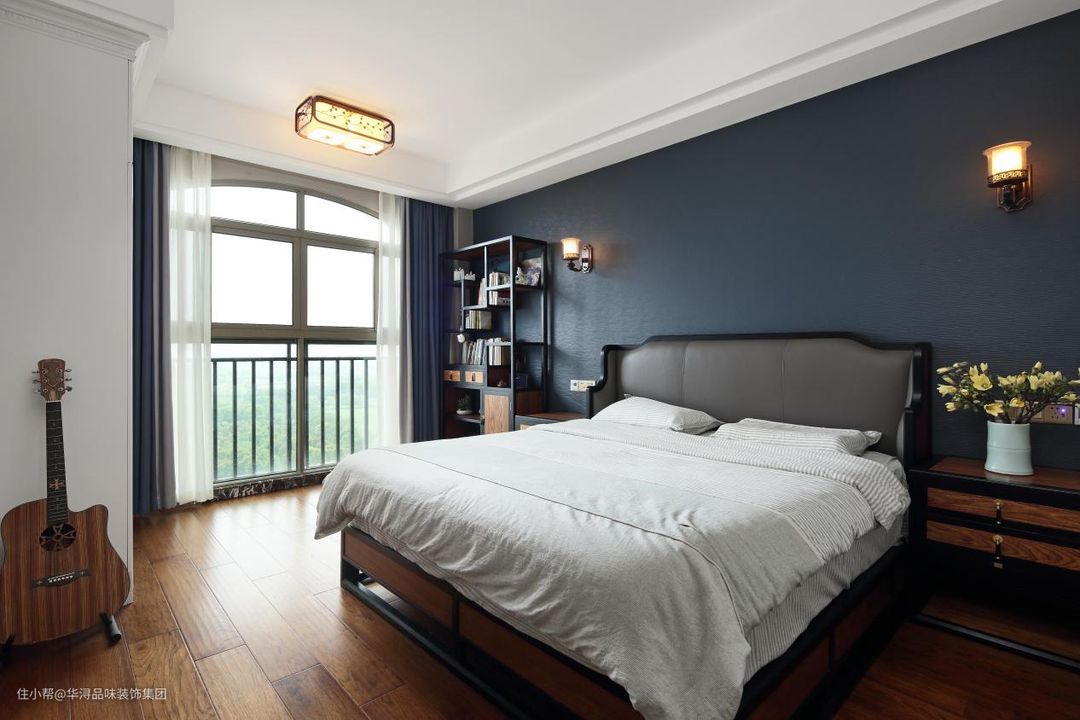 主卧有一处拐角设计,但不影响整体美观程度。床体居中摆放,床头是灰色皮质材料,软软的靠上去更为舒服,并且和床头背景墙雾霾蓝的颜色能良好地融合在一起,能凸显出自己但不显得突兀。