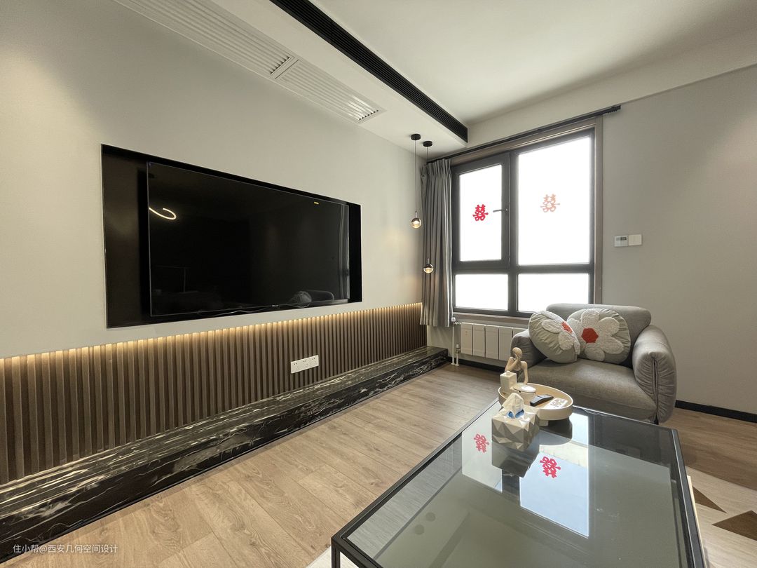 电视采用镶嵌的形式安装,一是为了节省空间,二是为了视觉上的美观性,电视后面杂乱的电线也都藏在了里面,不会造成杂乱的感受。电视下方做了竖向木纹板的设计,为这面空白的电视墙增添了装饰,镶嵌的灯带也为空间增添了氛围感。