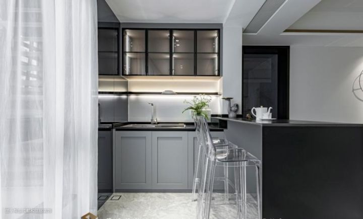 建议大家选择玻璃柜门的橱柜,这样开放性的感觉有了,也避免杂乱、油烟等问题。