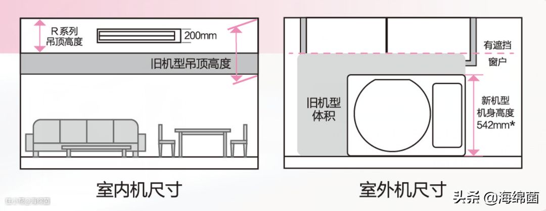 内机的高度也缩小到了仅有200mm,对于层高不高的户型来说更加友好。同时外机的尺寸也有了相应的缩小,安装摆放的时候就更加灵活了。