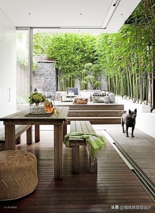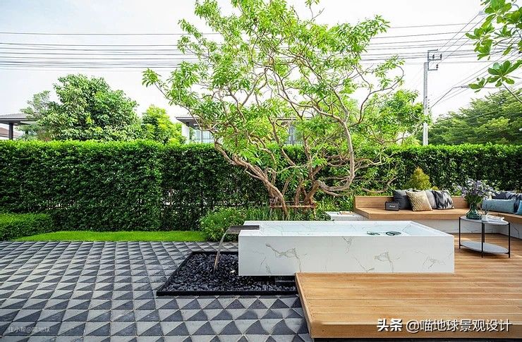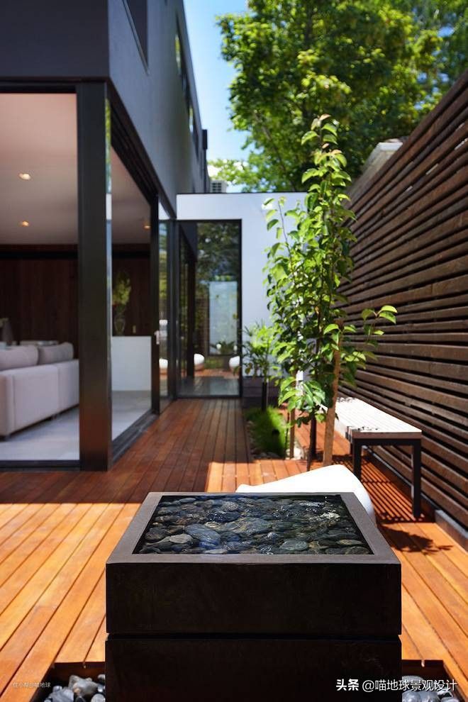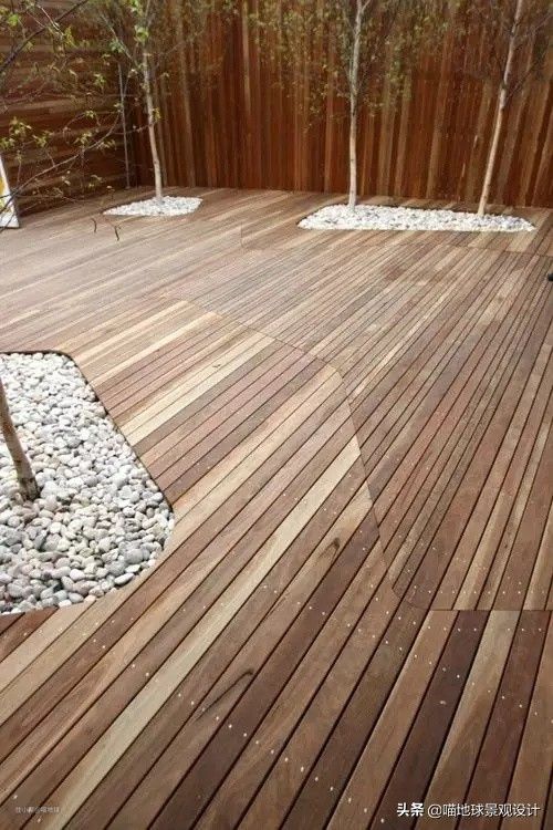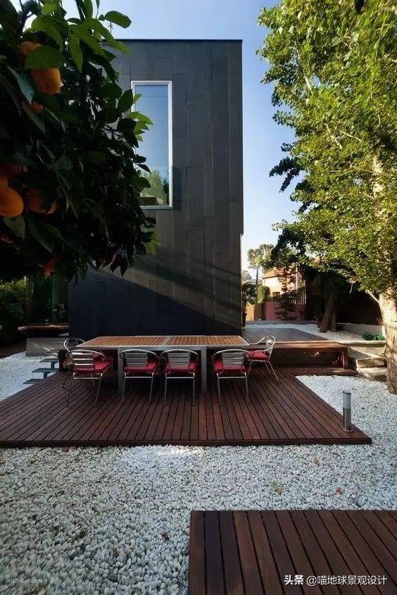 木铺装与砾石的结合也是庭院中常用的表现手法之一,当然以白色的砾石居多,显得干净整洁且自然。