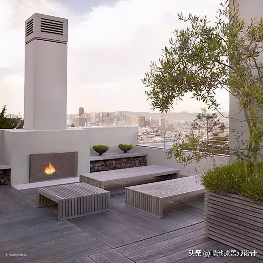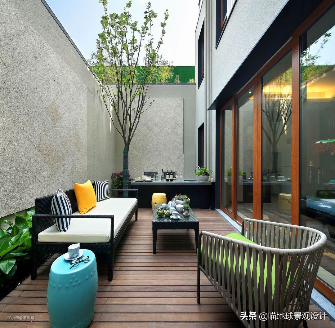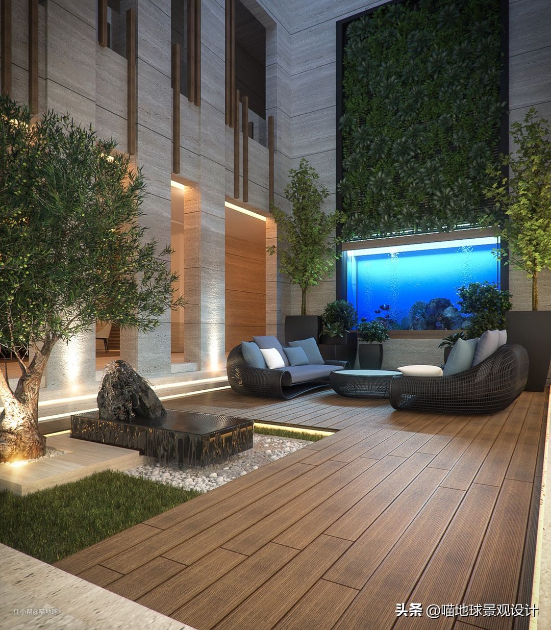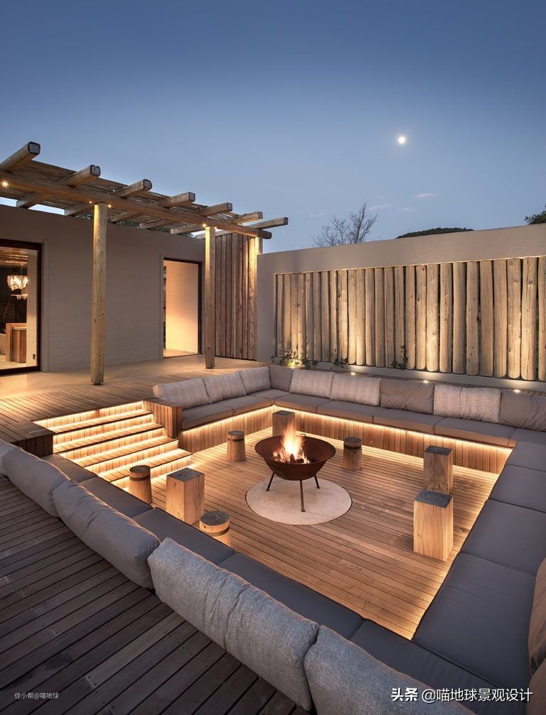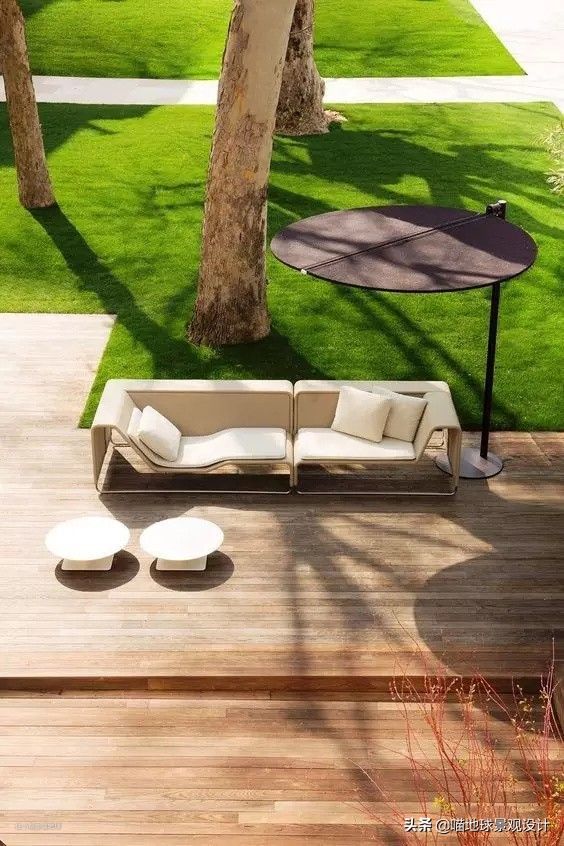 这里的冷暖关系大家看出来了吗,水池、草地为冷,木平台为暖,而且设计师还特意将沙发坐垫等都做成蓝色,对比就更加强烈了。