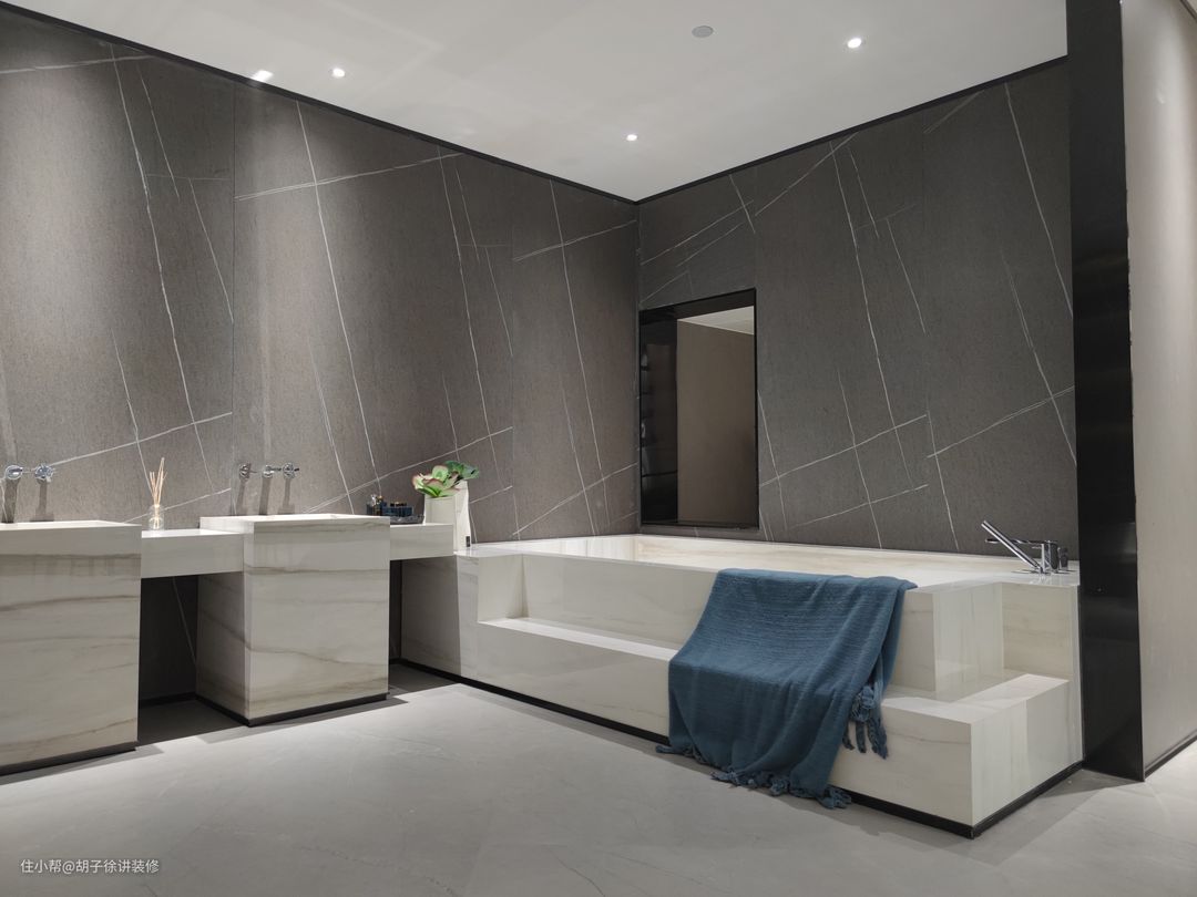 总结:岩板有不同规格不同厚度上墙下地、做柜面、台面等均可,但过于繁琐复杂的加工,由于专业团队未大面积覆盖相对价格较高。预算允许同时还有靠谱的团队在饰面材料选择上优先考虑岩板!