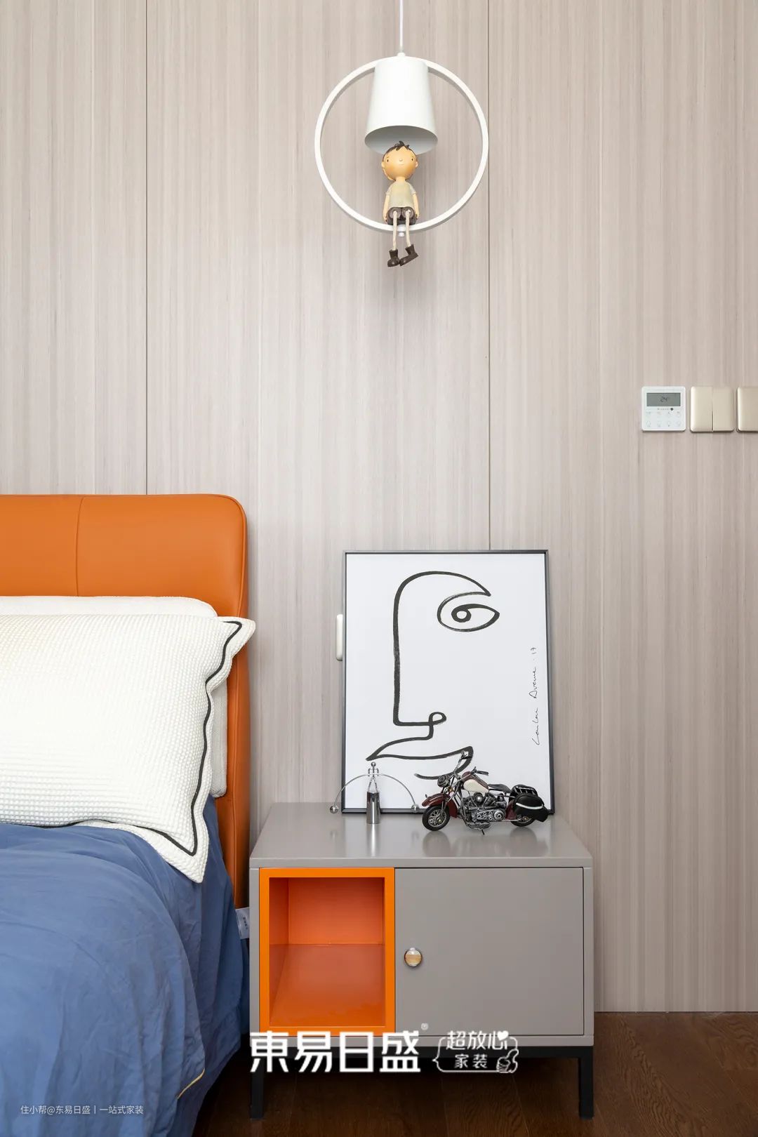 男孩房硬装上没有过于儿童化,温润素雅的主色调与活泼靓丽的爱马仕橙色相互碰撞,加以蓝色床品、挂画点缀,让整个空间更加的个性化。