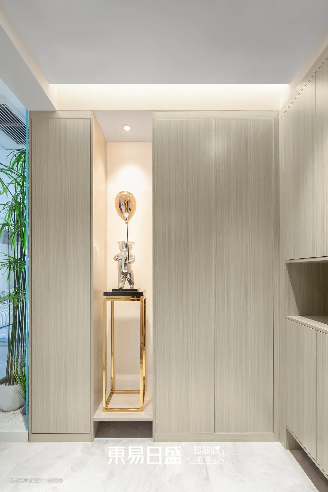镂空嵌入的小熊手办和玻璃隔起来的绿植景观,既是玄关生活功能的完善,也是一种空间艺术的演绎,出入户的仪式感就此形成。