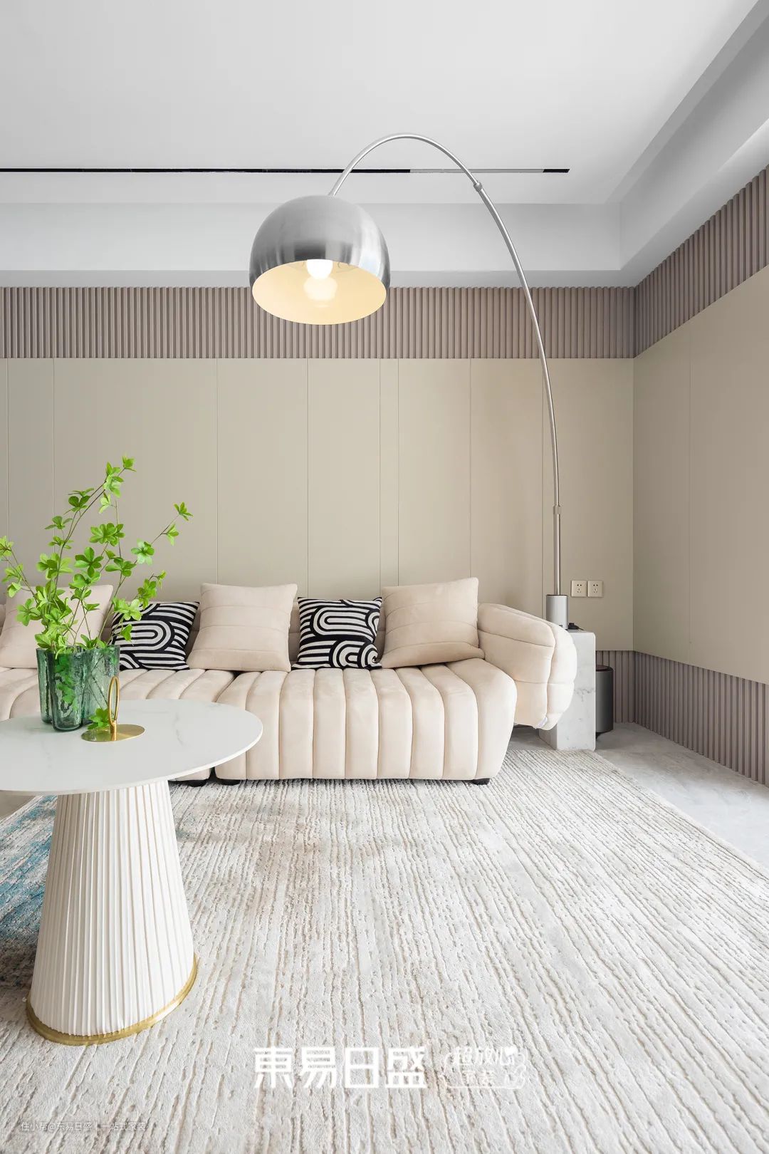 圆润造型的沙发,轻易便抓住了人的眼球,给人低奢舒适的初印象。往四周打量,沙发背景墙用原木格栅与浅咖色木饰面结合,提升空间质感。米白色、绿色的点缀,让整体氛围更加灵动。