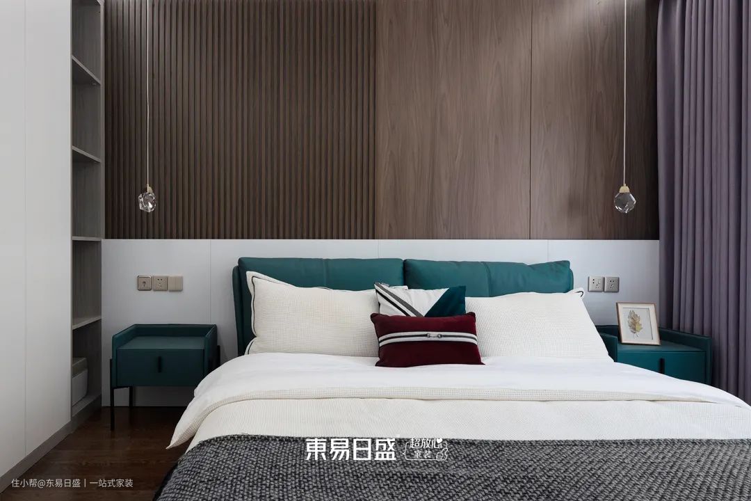 床头背景墙做半墙设计,咖色的格栅与木饰面拼接,嵌入灯线催发出空间沉着笃定又不失温馨的高级气质,不同木材的温润质感,营造出简单舒适的休息空间。