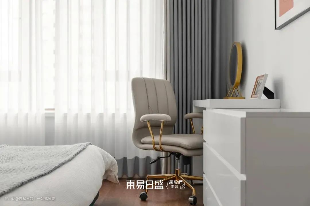 床尾是女业主的梳妆台,早上化妆、晚上卸妆,动线最佳!线条感十足的梳妆台,在房间中也是一道亮丽的风景线。