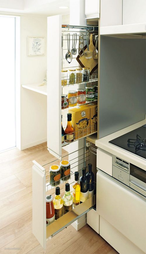 至于各种挂件、调料瓶,可以利用橱柜的多余空间设计一个抽拉式侧柜,完美进行收纳~