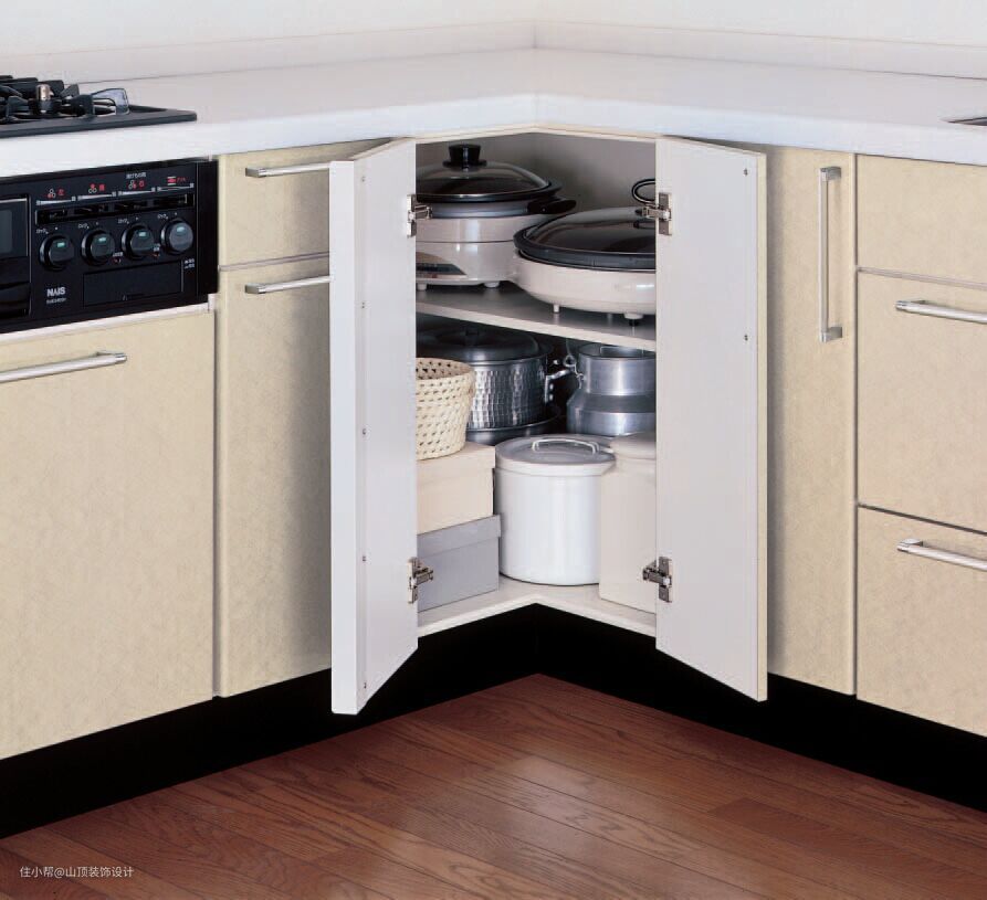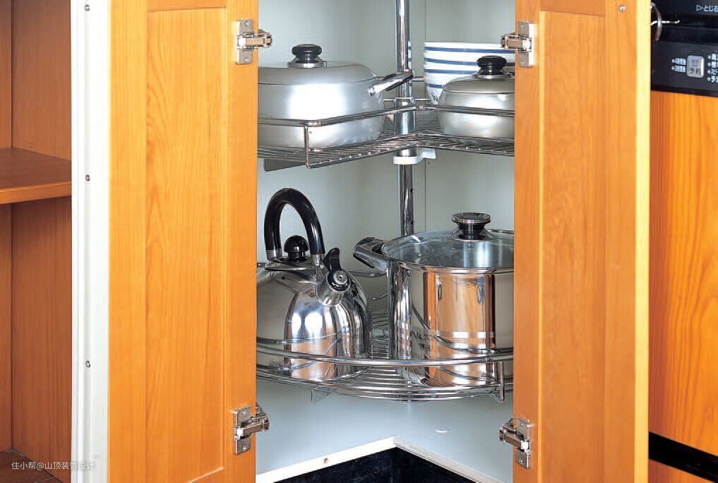 而体积更大、使用频率也更低的水壶和各种铝锅,可以考虑设计双开门,放到橱柜直角转角处(这个位置取用物品不便,一般来说空间应用率都不高)。